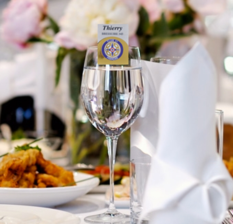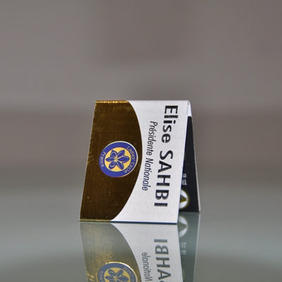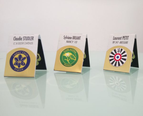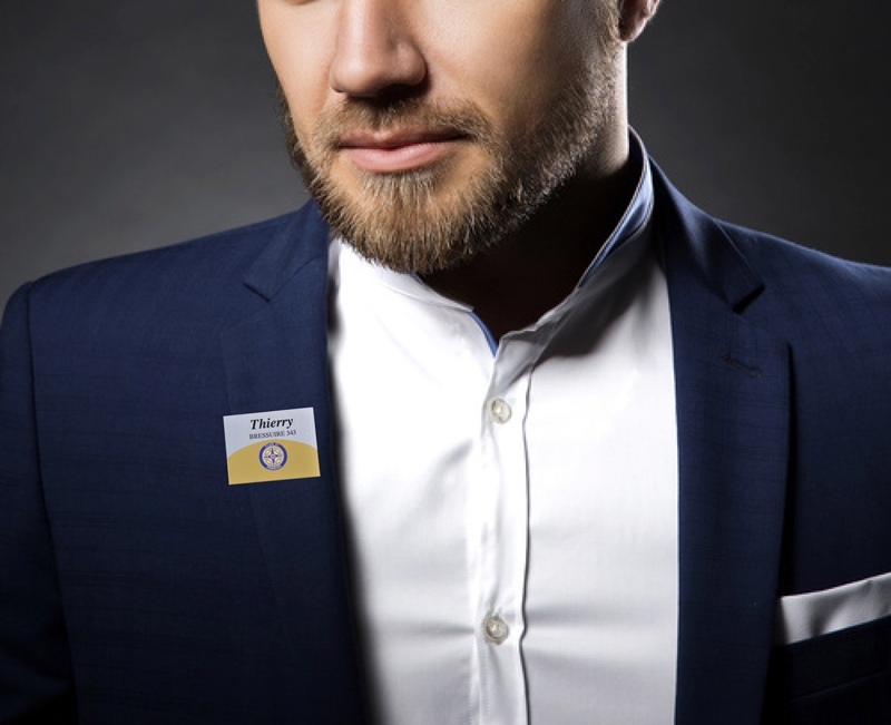 Personnalisation nominative du 2 faces. A l'horizontale pour lecture sur un revers de veste ou de chemise, à la verticale pour visisbilité sur une pochette de veste, de chemise ou un décoletté.